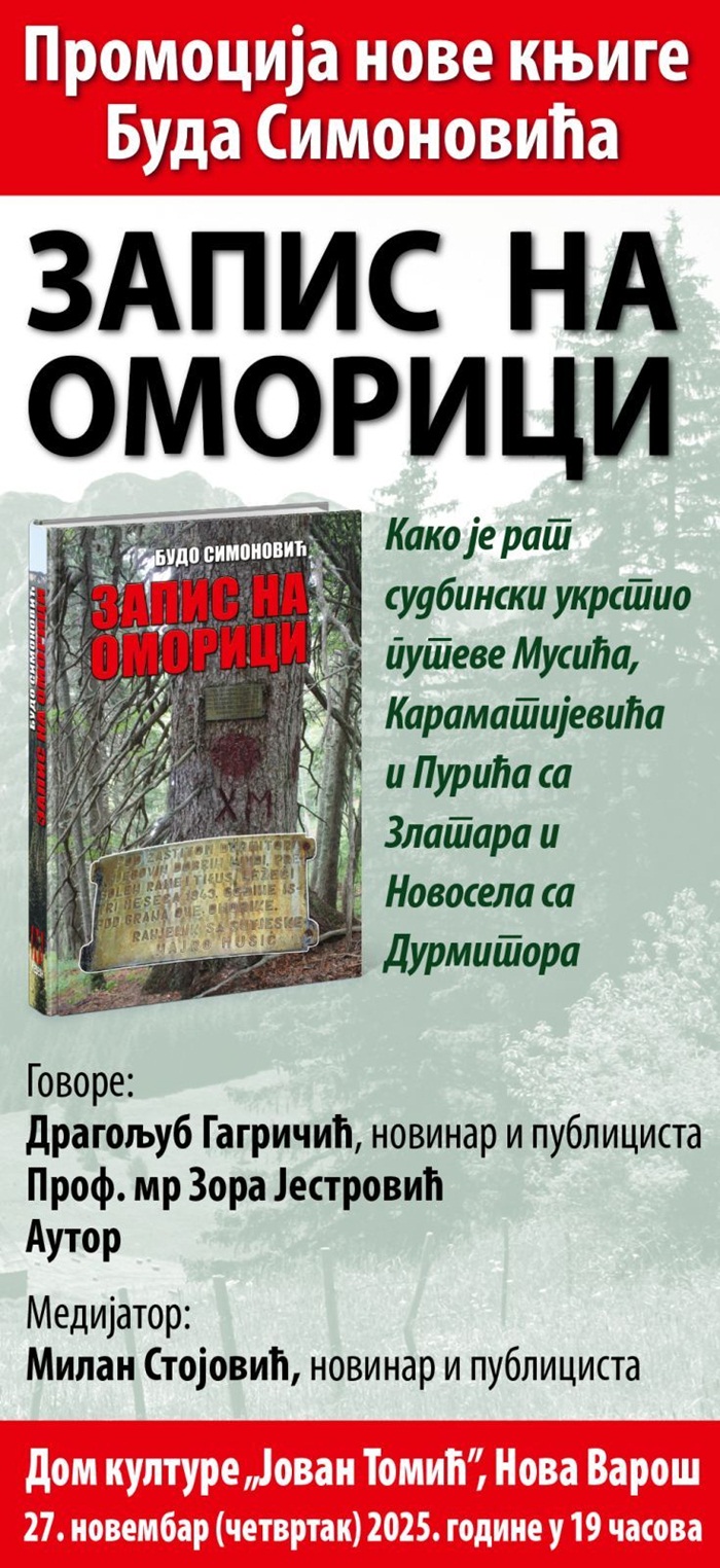 У Дому културе „Јован Томић“ у Новој Вароши у четвртак, 27. новембра, у 19 часова, промовисаће се књига “Запис на оморици” Буда Симоновића, новинара и публицисте из Подгорице.