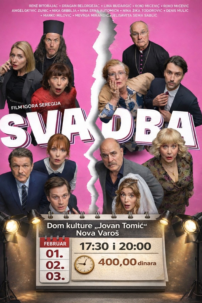 Само пар дана након премијере у Загребу и Београду, и Нововарошани ће имати прилику да у свом граду 1, 2 и 3.фебруара погледају тренутно најактуелнији филм у земљама бивше Југославије „Свадба“, у режији и по сценарију Игора Шерегија. У великој сали Дома културе „Јован Томић“ у недељу, понедељак и уторак биће приказане по две пројекције, у 17 и 30 и 20 сати, а цена биоскопске карте је 400 динара.